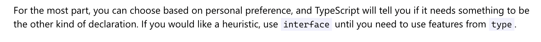 그냥 다 interface로 사용하면 되는 거 아닐까라는 생각을 했는데 타입스크립트 공식문서에도 개인적 선호에 따라 인터페이스와 타입 중에 선택해서 사용할 수 있고, 잘 모르겠다면, 우선 interface를 사용하고 이후 문제가 발생하였을 때 type을 사용하라고 적혀있었습니다.